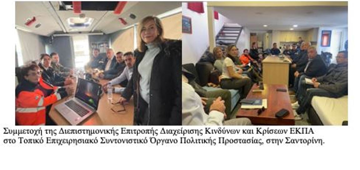 Την Τρίτη 18 Φεβρουαρίου, ο συντονιστής της Διεπιστημονικής Επιτροπής Διαχείρισης Κινδύνων και Κρίσεων του ΕΚΠΑ, κ. Ευθύμιος Λέκκας, συνοδευόμενος από τα μέλη της Επιτροπής, κ. Αντωναράκου και κ. Ευελπίδου, επισκέφθηκαν τη Σαντορίνη και πραγματοποίησαν συνάντηση με το Τοπικό Επιχειρησιακό Συντονιστικό Όργανο Πολιτικής Προστασίας (ΤΕΣΟΠΠ). Στόχος της συνάντησης ήταν η ενημέρωση και ο καλύτερος συντονισμός όλων των επιχειρησιακών ομάδων που δραστηριοποιούνται στο νησί.