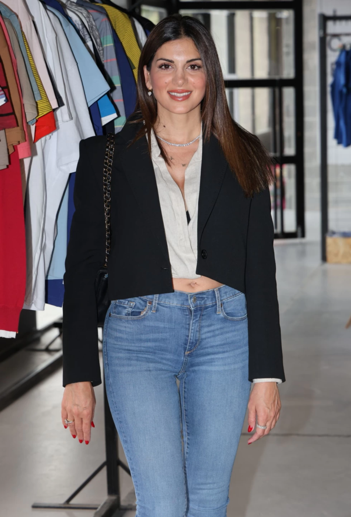 Για την εμφάνισή της η Σταματίνα Τσιμτσιλή επέλεξε ένα casual σύνολο με λευκό cropped πουκάμισο με skinny τζιν παντελόνι και cropped μαύρο σακάκι.