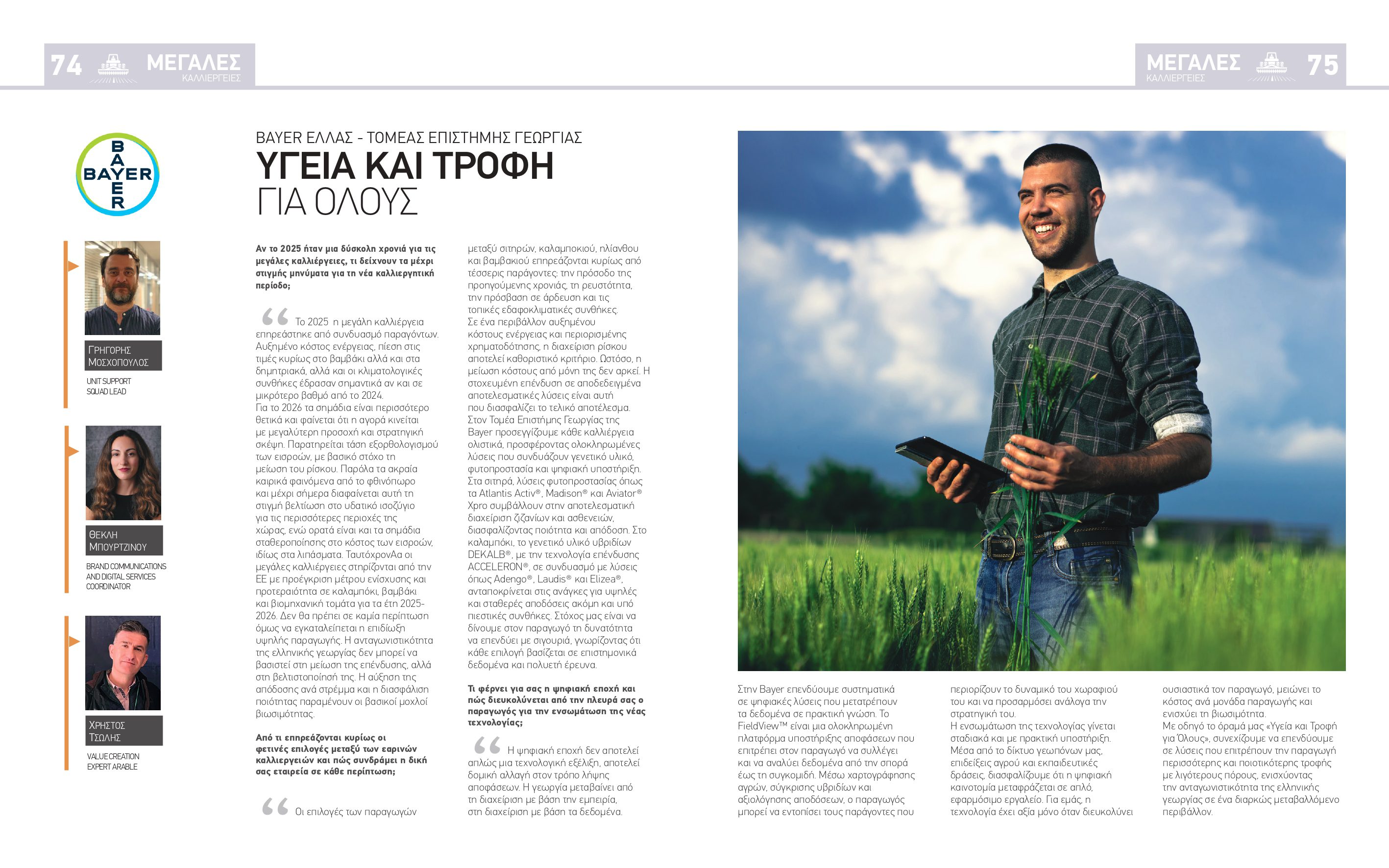 Οι επιλογές των παραγωγών µεταξύ σιτηρών, καλαµποκιού, ηλίανθου και βαµβακιού επηρεάζονται κυρίως από τέσσερις παράγοντες: την πρόσοδο της προηγούµενης χρονιάς, τη ρευστότητα, την πρόσβαση σε άρδευση και τις τοπικές εδαφοκλιµατικές συνθήκες. Σε ένα περιβάλλον αυξηµένου κόστους ενέργειας και περιορισµένης χρηµατοδότησης, η διαχείριση ρίσκου αποτελεί καθοριστικό κριτήριο. Ωστόσο, η µείωση κόστους από µόνη της δεν αρκεί. Η στοχευµένη επένδυση σε αποδεδειγµένα αποτελεσµατικές λύσεις είναι αυτή που διασφαλίζει το τελικό αποτέλεσµα. Στον Τοµέα Επιστήµης Γεωργίας της Bayer προσεγγίζουµε κάθε καλλιέργεια ολιστικά, προσφέροντας ολοκληρωµένες λύσεις που συνδυάζουν γενετικό υλικό, φυτοπροστασία και ψηφιακή υποστήριξη. Στα σιτηρά, λύσεις φυτοπροστασίας όπως τα Atlantis Activ®, Madison® και Aviator® Xpro συµβάλλουν στην αποτελεσµατική διαχείριση ζιζανίων και ασθενειών, διασφαλίζοντας ποιότητα και απόδοση. Στο καλαµπόκι, το γενετικό υλικό υβριδίων DEKALB®, µε την τεχνολογία επένδυσης ACCELERON®, σε συνδυασµό µε λύσεις όπως Adengo®, Laudis® και Elizea®, ανταποκρίνεται στις ανάγκες για υψηλές και σταθερές αποδόσεις ακόµη και υπό πιεστικές συνθήκες. Στόχος µας είναι να δίνουµε στον παραγωγό τη δυνατότητα να επενδύει µε σιγουριά, γνωρίζοντας ότι κάθε επιλογή βασίζεται σε επιστηµονικά δεδοµένα και πολυετή έρευνα.