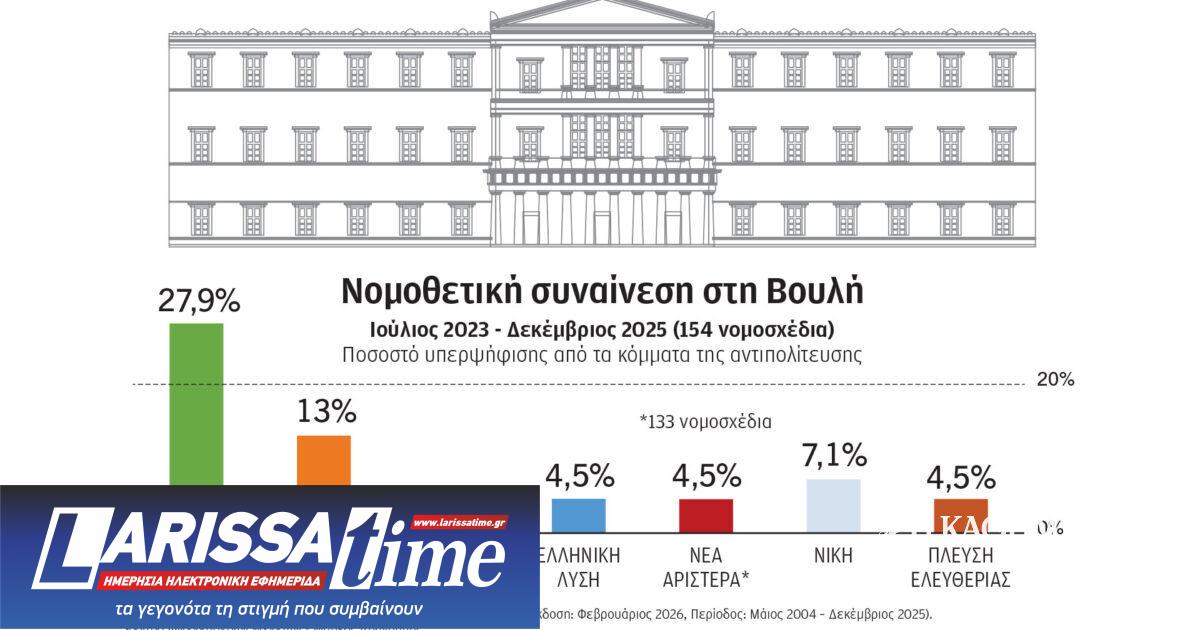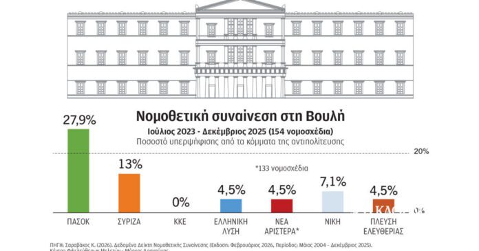 Τη μεγάλη πόλωση που επικρατεί στο πολιτικό σκηνικό επιβεβαιώνει η μελέτη του Κέντρου Φιλελεύθερων Μελετών (ΚΕΦίΜ) για τον Δείκτη Νομοθετικής Συναίνεσης, στην οποία αποτυπώνεται ο βαθμός στήριξης των κομμάτων της αντιπολίτευσης στα νομοσχέδια που έφερε προς ψήφιση η κυβέρνηση στη Βουλή από τον Ιούλιο του 2023, δηλαδή αμέσως μετά τις τελευταίες εκλογές, έως και τον Δεκέμβριο του 2025.