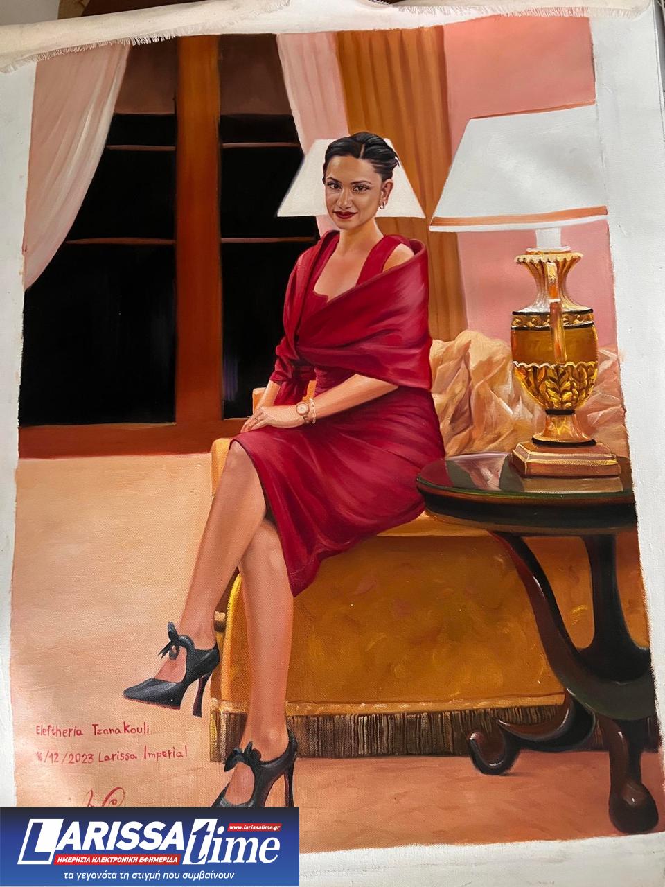 Άνοιξε με έκδηλη απορία το σωληνοειδές κουτί στο γραφείο της, αντικρύζοντας με έκπληξη ότι μέσα είχε έναν πίνακα ζωγραφικής με την μορφή της! Το έργο ήταν σε μουσαμά, τυλιγμένο σε ρολό, και όταν το ξεδίπλωσε διαπίστωσε ότι ήταν ίσα με το μπόι της. Είναι ο πίνακας που εικονίζεται ακριβώς από πάνω και φιλοτεχνήθηκε αντιγράφοντας φωτογραφία της περιφερειακής συμβούλου από δεξίωση που είχε κάνει για την γιορτή της.