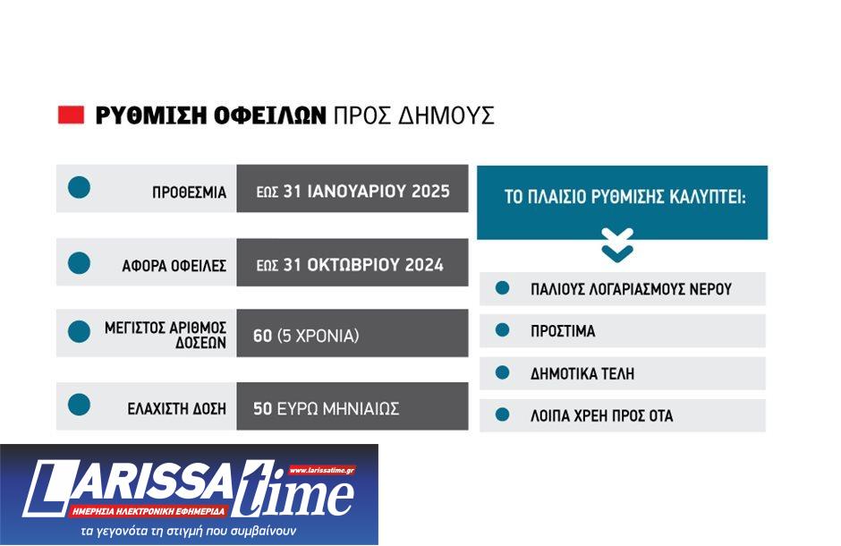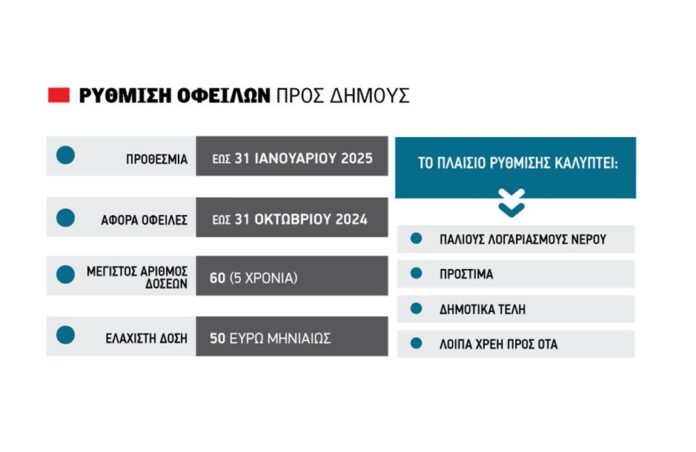 Η ρύθμιση αφορά κάθε είδους οφειλές φυσικών και νομικών προσώπων προς τους δήμους και τα νομικά τους πρόσωπα (όπως οι Δημοτικές Επιχειρήσεις Ύδρευσης και Αποχέτευσης – ΔΕΥΑ) που βεβαιώθηκαν έως τις 31 Οκτωβρίου 2024. Η αίτηση του οφειλέτη για την υπαγωγή στη ρύθμιση υποβάλλεται στην αρμόδια υπηρεσία του δήμου, της περιφέρειας ή του νομικού του προσώπου.