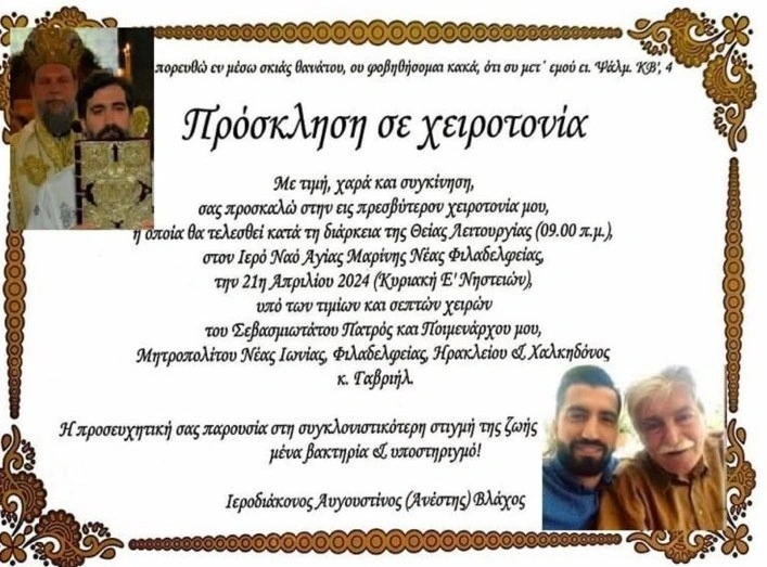 Η χειροτονία του θα τελεστεί πριν από το Πάσχα, την Κυριακή 21 Απριλίου, στον ιερό ναό Αγίας Μαρίνας στη Νέα Φιλαδέλφεια.