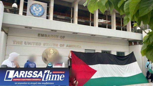 Παρέμβαση έξω από την αμερικάνικη πρεσβεία πραγματοποίησε η φοιτητική ομάδα του Ρουβίκωνα την Τρίτη, σε ένδειξη αλληλεγγύης στον λαό της Παλαιστίνης και τις φοιτητικές κινητοποιήσεις και καταλήψεις στα πανεπιστήμια των ΗΠΑ.