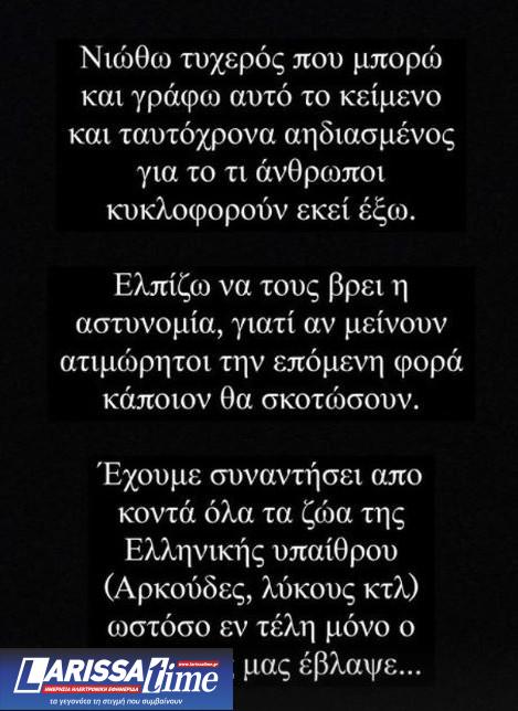 Στην ανάρτησή του, καταλήγοντας ο εθελοντής εκφράζει την αγανάκτησή του αναφέροντας: «Έχουμε συναντήσει από κοντά όλα τα ζώα της ελληνικής υπαίθρου, ωστόσο εν τέλει μόνο ο άνθρωπος μας έβλαψε»…