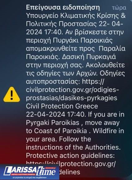 «Αν βρίσκεστε στην περιοχή Πυργάκι Παροικιάς απομακρυνθείτε προς Παραλία Παροικιάς. Δασική πυρκαγιά στην περιοχή σας. Ακολουθείτε τις οδηγίες των αρχών», έγραφε το μήνυμα του 112.