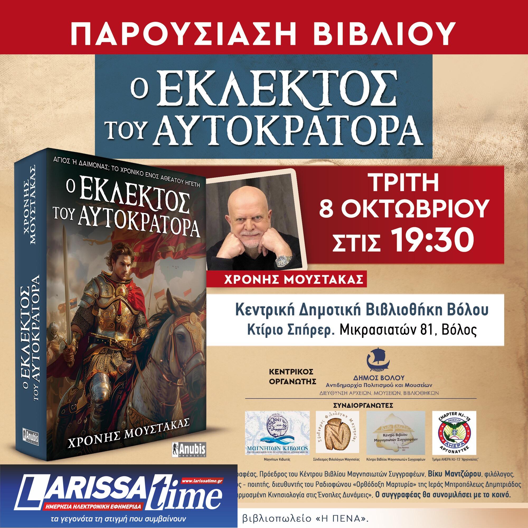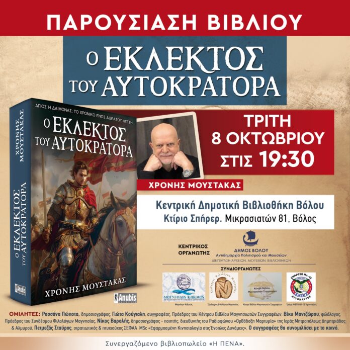 Την Τρίτη 8 Οκτωβρίου στις 7.30 μ.μ. στην Κεντρική Βιβλιοθήκη Δήμου Βόλου(Μικρασιατών 81, κτήριο Σπίρερ) θα πραγματοποιηθεί εκδήλωση παρουσίασης τουβιβλίου του Χρόνη Μουστάκα «Ο εκλεκτός του Αυτοκράτορα».