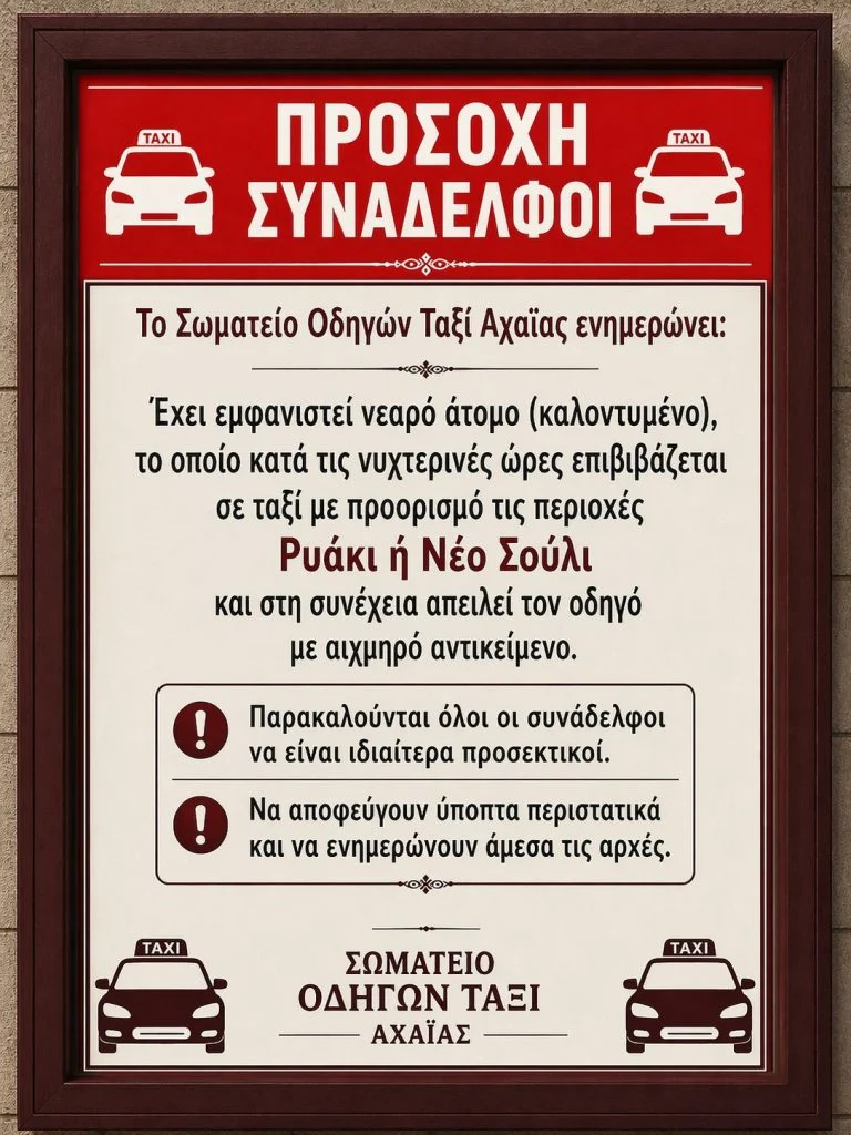 Σύμφωνα με την σχετική ενημέρωση από το Σωματείο της Αχαΐας, το άτομο περιγράφεται ως καλοντυμένο, και επιβιβάζεται σε ταξί ζητώντας ως προορισμό τις περιοχές Ρυάκι ή Νέο Σούλι. Όπως καταγγέλλεται, στη συνέχεια απειλεί τον οδηγό με αιχμηρό αντικείμενο.