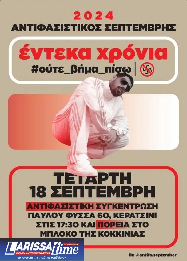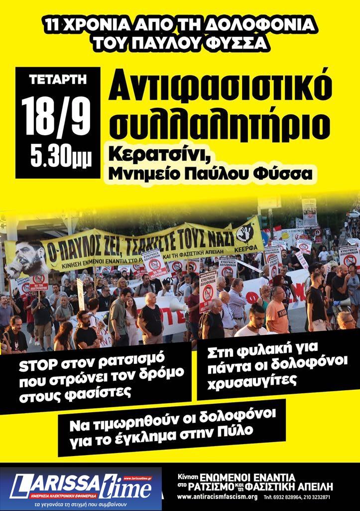 Η διαδήλωση για τη θλιβερή επέτειο της δολοφονίας του αντιφασίστα μουσικού Killah P., όπως ήταν γνωστός ο Παύλος Φύσσας, θα γίνει στο Κερατσίνι. Η πορεία θα ξεκινήσει από το μνημείο που έχει ανεγερθεί για τον Παύλο Φύσσα στις 17:30 το απόγευμα (οδός Φύσσα 60) και θα κατευθυνθεί προς τη Μάντρα Μπλόκου της Κοκκινιάς.