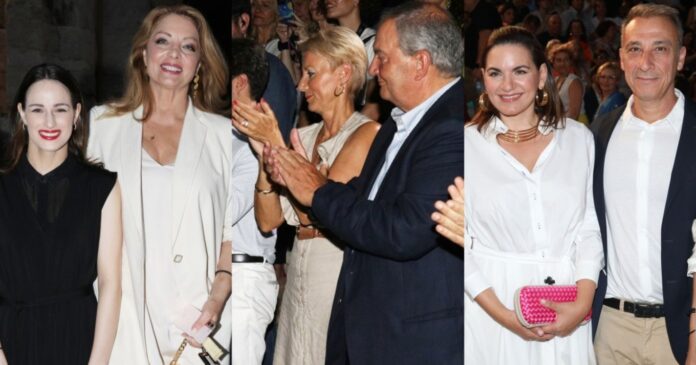 Τη συναυλία παρακολούθησαν η Άντζελα Γκερέκου και η κόρη της, Μαρία Βοσκοπούλου. Η ηθοποιός και πρόεδρος του ΕΟΤ εμφανίστηκε με κατάλευκο κοστούμι με ρίγες και λευκό μπλουζάκι. Το συνδύασε με εσπαντρίγιες. Η ίδια ήταν πανέμορφη και πολύ ανανεωμένη.