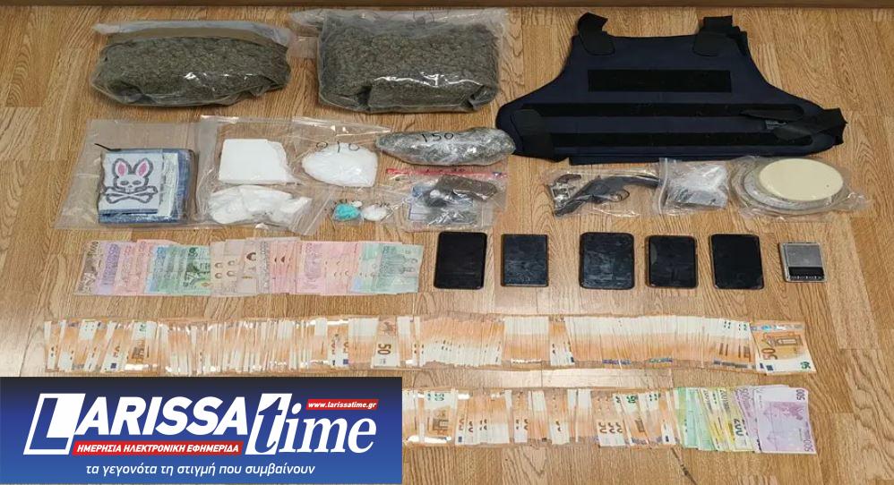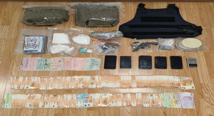 Ειδικότερα, σε έρευνα που πραγματοποιήθηκε στην οικία του 33χρονου και του 21χρονου, ο πρώτος εντοπίστηκε να κατέχει και για λογαριασμό των συγκατηγορουμένων του, με σκοπό την περαιτέρω διακίνηση σε τρίτους, -7- συσκευασίες με κοκαΐνη, μεικτού βάρους -2.153- γραμμαρίων, -3- συσκευασίες με ακατέργαστη κάνναβη, μεικτού βάρους -2.130- γραμμαρίων και -2- συσκευασίες με κατεργασμένη κάνναβη (σοκολάτα), συνολικού μεικτού βάρους -131- γραμμαρίων. Επίσης, βρέθηκαν και κατασχέθηκαν -2- περίστροφα, -62- φυσίγγια και αλεξίσφαιρο γιλέκο.