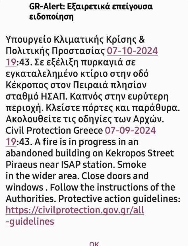 Μάλιστα λίγο πριν τις 20.00, εστάλη μήνυμα του 112 στους κατοίκους της περιοχής. «Σε εξέλιξη πυρκαγιά σε εγκαταλελειμμένο κτίριο στην οδός Κέκροπός στον Πειραιά πλησίον σταθμού ΗΣΑΠ. Καπνός στην ευρύτερη περιοχή. Κλείστε πόρτες και παράθυρα. Ακολουθείτε τις οδηγίες των Αρχών» αναφέρει το μήνυμα του 112.