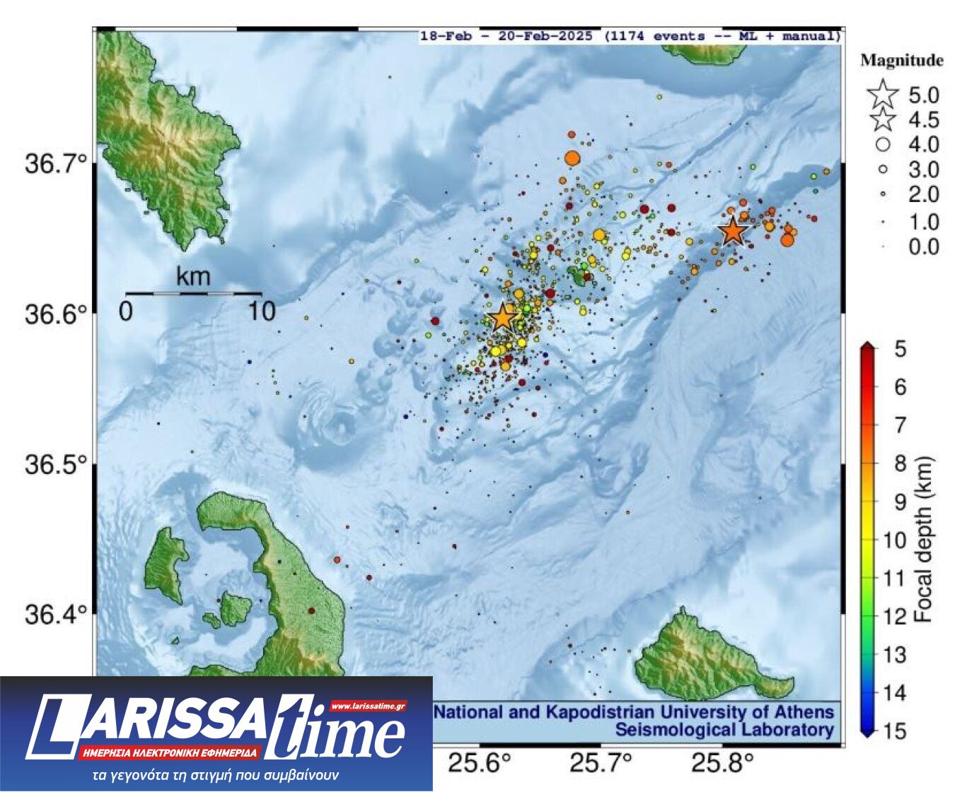 Από την έναρξη της σεισμικής δραστηριότητας στη ζώνη Σαντορίνης-Αμοργού στις 26 Ιανουαρίου έως και τις 19 Φεβρουαρίου 2025, το Εργαστήριο Σεισμολογίας (ΕΣ) του ΕΚΠΑ (http://dggsl.geol.uoa.gr/) έχει ανιχνεύσει και εντοπίσει συνολικά, με αυστηρά κριτήρια για τη διασφάλιση της ποιότητας των αποτελεσμάτων, πάνω από 22.600 σεισμούς με μεθόδους μηχανικής μάθησης (τεχνητής νοημοσύνης), εκ των οποίων άνω των 19,300 με μεγέθη Μ³1.0. Στις 18 Φεβρουαρίου καταγράφηκαν πάνω από 600 σεισμοί, με 37 να έχουν μέγεθος Μ³2.5, τρεις (3) σεισμούς με Μ³4.0, και δύο (2) με Μ³4.5, με τους δύο ισχυρότερους σεισμούς, μεγέθους 4.9, να σημειώνονται στις 06:46:53 και 08:08:09 (τοπική ώρα). Στις 19 Φεβρουαρίου καταγράφηκαν πάνω από 450 σεισμοί, με 27 να έχουν μέγεθος Μ³2.5, έναν (1) σεισμό με Μ³4.0, και κανέναν (0) με Μ³4.5, με τον ισχυρότερο σεισμό μεγέθους 4.2 να καταγράφεται στις 11:41:09 (τοπική ώρα) βόρεια της Ανύδρου. Σύμφωνα με τα στοιχεία καθημερινής ανάλυσης σεισμικών δεδομένων (χωρίς χρήση μεθόδων μηχανικής μάθησης) του Εργαστηρίου Σεισμολογίας του ΕΚΠΑ, κατά την 20η Φεβρουαρίου έχουν καταγραφεί 57 σεισμοί, εκ των οποίων κανένας (0) με μέγεθος M³4.0. O ισχυρότερος σεισμός, μεγέθους 3.7, σημειώθηκε στις 00:09:53 της 21ης Φεβρουαρίου (τοπική ώρα). Η σεισμικότητα παρουσιάζει σταδιακή ύφεση, τόσο ως προς τον ημερήσιο αριθμό σεισμών όσο και ως προς το μέγιστο μέγεθος, χωρίς να έχει παρατηρηθεί κάποια νέα μικροσεισμική έξαρση από τις 15 Φεβρουαρίου.