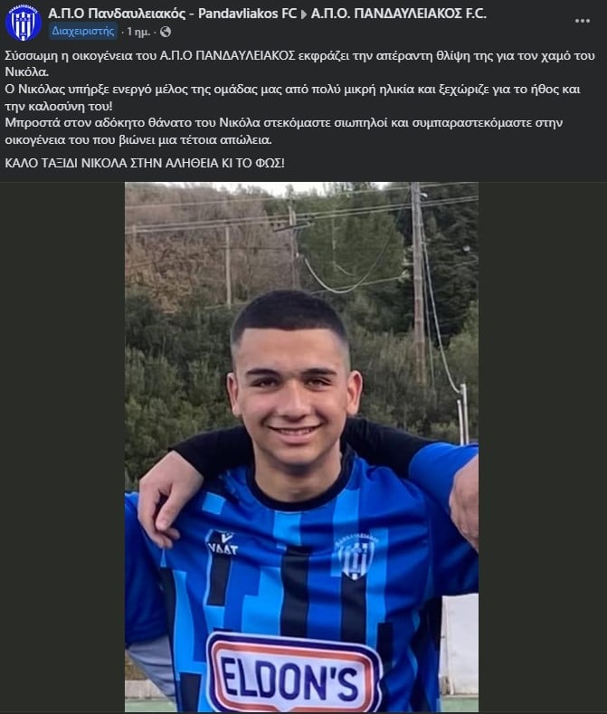Η Α.Π.Ο. Πανδαυλειακός αποχαιρετά δημόσια τον νεαρό ποδοσφαιριστή. Η ομάδα δημοσιοποιεί συλλυπητήρια ανακοίνωση και αναφέρει: «Σύσσωμη η οικογένεια του Α.Π.Ο ΠΑΝΔΑΥΛΕΙΑΚΟΣ εκφράζει την απέραντη θλίψη της για τον χαμό του Νικόλα. Ο Νικόλας υπήρξε ενεργό μέλος της ομάδας μας από πολύ μικρή ηλικία και ξεχώριζε για το ήθος και την καλοσύνη του!».