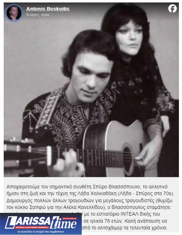 «Αποχαιρετούμε τον σημαντικό συνθέτη Σπύρο Βλασσόπουλο, το αλλοτινό ήμισυ στη ζωή και την τέχνη της Λήδα Χαλκιαδάκη (Λήδα – Σπύρος στα 70s). Δημιουργός πολλών άλλων τραγουδιών για μεγάλους τραγουδιστές (θυμίζω τον κύκλο Σαπφώ για την Αλέκα Κανελλίδου), ο Βλασσόπουλος σταμάτησε νωρίς τη μουσική για να ασχοληθεί με το εστιατόριο ΙΝΤΕΑΛ δικής του ιδιοκτησίας».