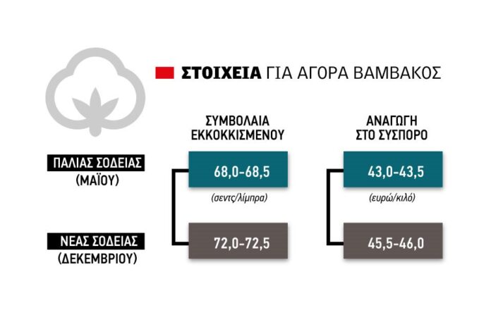 Τα συμβόλαια νέας σοδειάς (Δεκεμβρίου) εκκοκκισμένου την Τρίτη 17 Μαρτίου ξεπέρασαν τα 72 σεντς ανά λίμπρα, με την αναγωγή στο σύσπορο να δίνει περίπου 45,5-46 λεπτά. Την ίδια στιγμή ανοδικά κινούνται και τα συμβόλαια παλιάς σοδειάς (Μαΐου) που αγγίζουν τα 68,38 σεντς. Έτσι προεξοφλείται κάτι καλύτερο για τις προοπτικές της νέας σεζόν και δημιουργούνται ελπίδες για ένα θετικό σενάριο κερδοφορίας.