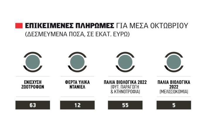 • Έως 15 Οκτωβρίου παλιά Βιολογικά (εξόφληση 30% στα 60 εκατ. ευρώ), φερτά υλικά από Ντάνιελ στα 12 εκατ. ευρώ και de minimis ζωοτροφών στα 63 εκατ. ευρώ.