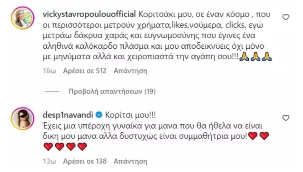 Κάτω από το post της παρουσιάστριας του MEGA, λοιπόν, η μητέρα της έκανε ένα σχόλιο γεμάτο υπονοούμενα ξανά, ενώ σχόλιο άφησε και η Δέσποινα Βανδή με τη σειρά της, χειροκροτώντας την Βίκυ Σταυροπούλου, επισημαίνοντας πόσο καλά τα έχει καταφέρει. “Κοριτσάκι μου, σε έναν κόσμο, που οι περισσότεροι μετρούν χρήματα, likes, νούμερα, clicks, εγώ μετράω δάκρυα χαράς και ευγνωμοσύνης που έγινες ένα αληθινά καλόκαρδο πλάσμα και μου αποδεικνύεις όχι μόνο με μηνύματα αλλά και χειροπιαστά την αγάπη σου!!!”, έγραψε η Βίκυ Σταυροπούλου, ενώ η τραγουδίστρια σχολίασε: “Κορίτσι μου!!! Έχεις μια υπέροχη γυναίκα για μάνα που θα ήθελα να είναι δική μου μάνα αλλά δυστυχώς είναι συμμαθήτρια μου!”.