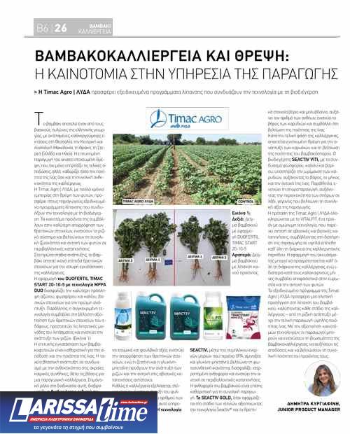 Η Timac Agro | ΛΥΔΑ, με πολλά χρόνια εμπειρίας στη θρέψη των φυτών, προσφέρει στους παραγωγούς εξειδικευμένα προγράμματα λίπανσης που συνδυάζουν την τεχνολογία με τη βιοδιέγερση. Τα καινοτόμα προϊόντα της συμβάλλουν στην καλύτερη απορρόφηση των θρεπτικών στοιχείων, ενισχύουν το ριζικό σύστημα και βελτιώνουν τη συνολική ζωτικότητα και αντοχή των φυτών σε περιβαλλοντικές καταπονήσεις.