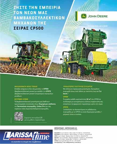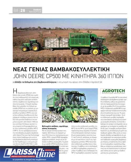 H βαµβακοσυλλεκτική John Deere νέας γενιάς CP500 έχει κερδίσει τους καλλιεργητές στη χώρα µας, καθώς εγγυάται αυξηµένη αποδοτικότητα, ακρίβεια και χαµηλότερο κόστος λειτουργίας.. Η σειρά περιλαµβάνει δύο µοντέλα, την έκδοση µε καλάθι CP550 και την έκδοση µε µηχανισµό σχηµατισµού στρογγυλών µονάδων (µπάλες) CP570, ενώ και οι δύο εκδόσεις διατίθενται στη διαµόρφωση τεσσάρων σειρών. Και τα δύο νέα µοντέλα διαθέτουν την καµπίνα χειριστή John Deere 1900 και τον κινητήρα 9,0 λίτρων γενιάς II, ενώ µπορούν να διαµορφωθούν µε τις νέες συλλεκτικές µονάδες MP12 ή MP16. Τα πιο πρόσφατα στοιχεία της τεχνολογίας γεωργίας ακριβείας John Deere Precision Ag Technology είναι επίσης διαθέσιµα για αυτά τα νέα βαµβακοσυλλεκτικά µηχανήµατα. Για παράδειγµα, ο ενσωµατωµένος δέκτης StarFireTM 7500, η οθόνη G5Plus CommandCenterTM και το µόντεµ R JDLinkTM* για αδιάλειπτη συνδεσιµότητα περιλαµβάνονται στον βασικό εξοπλισµό.