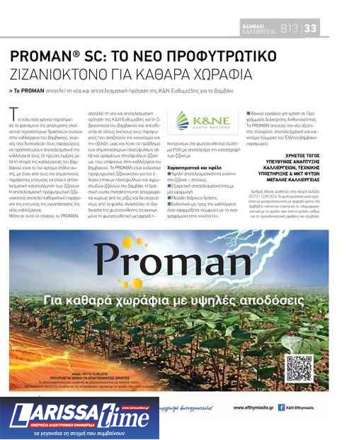 Μέσα σε αυτό το πλαίσιο, το PROMAN αποτελεί τη νέα και αποτελεσματική πρόταση της Κ&Ν Ευθυμιάδης για τη ζιζανιοκτονία του βαμβακιού και απευθύνεται σε όλους εκείνους τους παραγωγούς που αναζητούν την καινοτομία και την εξέλιξη, μιας και λύνει το πρόβλημα των σημαντικότερων πλατύφυλλων αλλά και ορισμένων στενόφυλλων ζιζανίων, που υπάρχουν στην καλλιέργεια του βαμβακιού. Το PROMAN είναι εκλεκτικό προφυτρωτικό ζιζανιοκτόνο για τον έλεγχο ετήσιων πλατύφυλλων και αγρωστωδών ζιζανίων στο βαμβάκι. Η δραστική ουσία metobromuron απορροφάται κυρίως από τις ρίζες και δευτερευόντως από τα φύλλα. Αναστέλλει τη διαδικασία της φωτοσύνθεσης (συγκεκριμένα τη φωτοσυνθετική μεταφορά ηλεκτρονίων στο φωτοσυνθετικό σύστημα PSII) με αποτέλεσμα την καταστροφή των ζιζανίων.