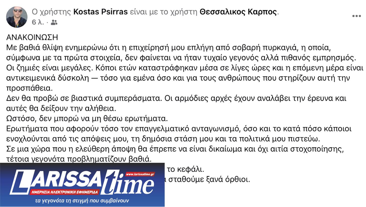 Πρόσφατη πυρκαγιά προκάλεσε ζημιές στις εγκαταστάσεις της για την οποία ο ιδιοκτήτης Κώστας Ψύρρας, με ανάρτησή του, εκφράζει υπόνοιες ότι πρόκειται για δολιοφθορά.