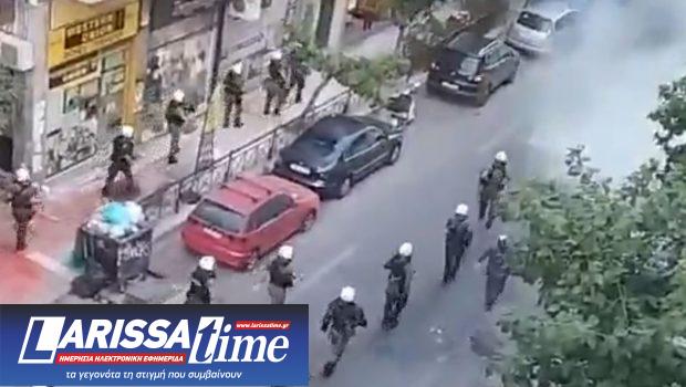 Συγκεκριμένα επιτέθηκαν με κοντάρια, μπογιές, πυροσβεστήρα, πέτρες, γυάλινα μπουκάλια και άλλα αντικείμενα σε βάρος αστυνομικών της Υποδιεύθυνσης Αποκατάστασης Τάξης που βρίσκονταν στο σημείο, με αποτέλεσμα την πρόκληση φθορών υπηρεσιακού εξοπλισμού.