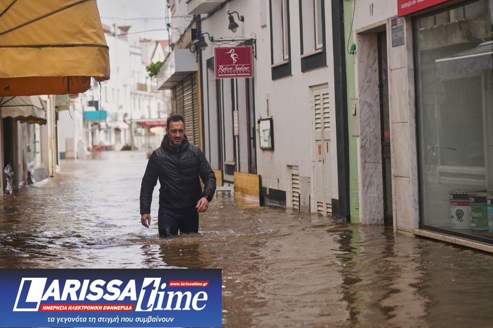 Κάτοικος περπατάει σε πλημμυρισμένο δρόμο μετά την υπερχείλιση του ποταμού Sado λόγω των ισχυρών βροχοπτώσεων στο Alcúcer do Sal.
