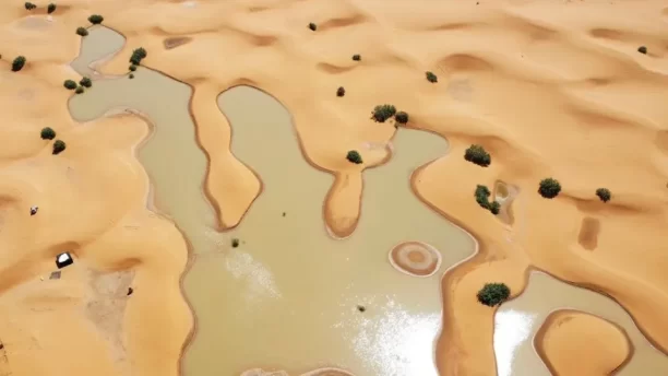 Μερικές από τις πιο δραματικές εικόνες είναι από την πόλη της ερήμου Μερζουγκά, όπου ο σπάνιος κατακλυσμός χάραξε νέες λίμνες στους αμμόλοφους.