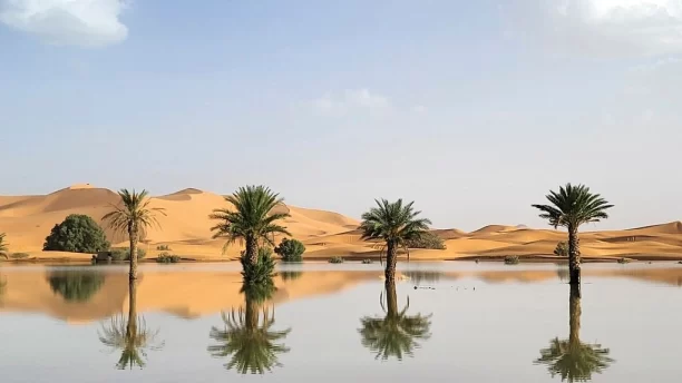 Οι αντανακλάσεις των φοινίκων της πόλης λαμπυρίζουν τώρα στην έκταση μιας νέας λιμνοθάλασσας, που πλαισιώνεται από απότομους αμμόλοφους.