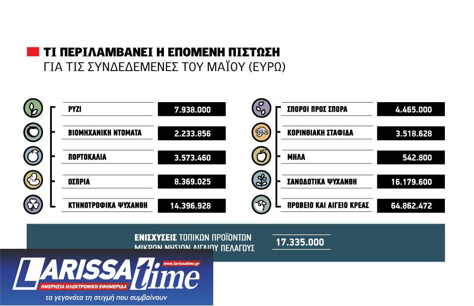 - Ενισχύσεις τοπικών προϊόντων µικρών νησιών Αιγαίου Πελάγους 17.335.000 ευρώ