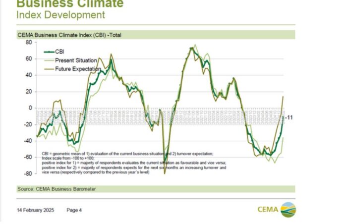 Περαιτέρω βελτίωση είδε ο δείκτης επιχειρηματικού κλίματος για την βιομηχανία αγροτικών μηχανημάτων της ΕΕ, που παραμένει, όμως, ακόμα σε αρνητικό έδαφος. Πιο συγκεκριμένα για τον