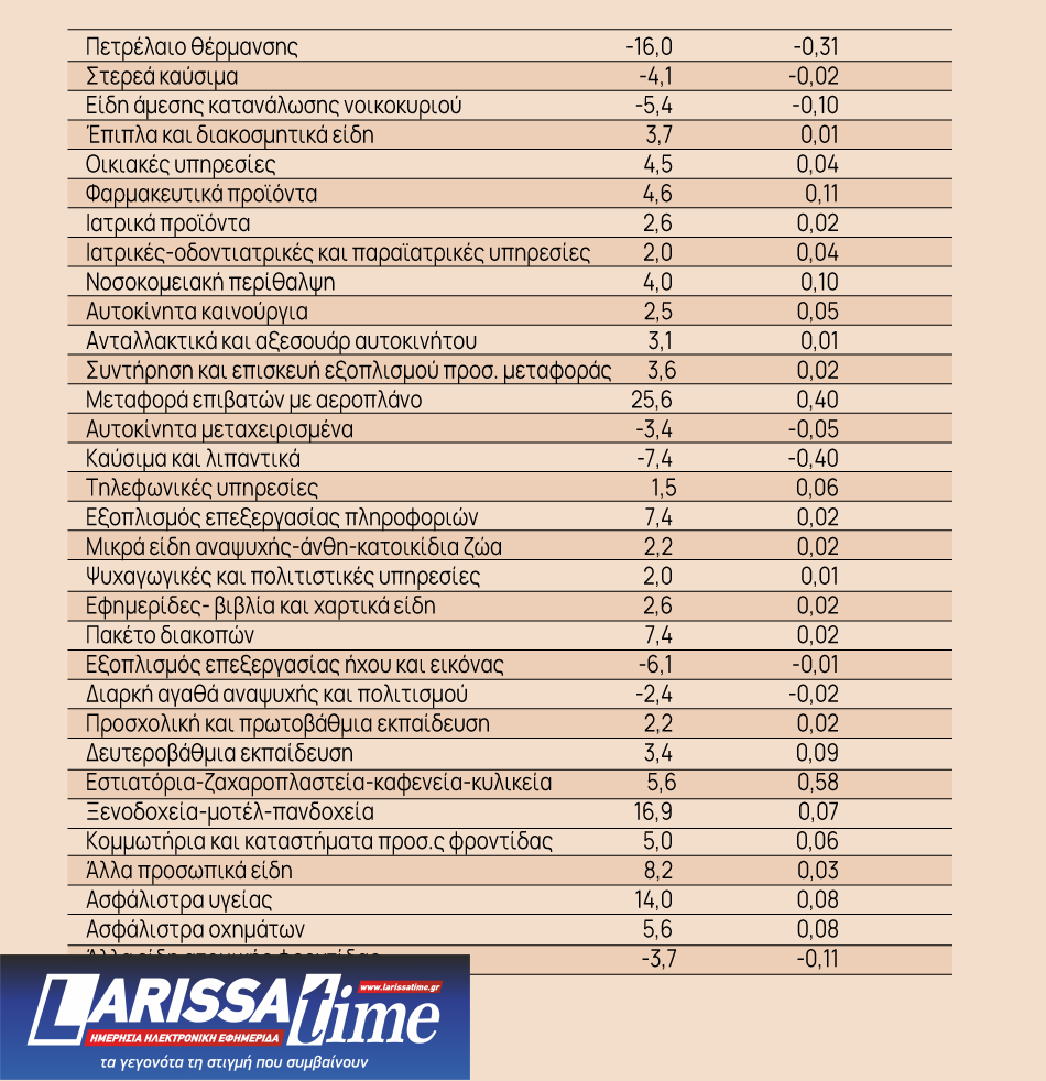 Σημαντική είναι και η αύξηση στο ρεύμα, το οποίο είναι ακριβότερο κατά 12,9%, ενώ το φυσικό αέριο κατά 10,2%. Μεγάλες είναι οι ανατιμήσεις στα αεροπορικά εισιτήρια με 25,6% και 16,9% στα ξενοδοχεία.