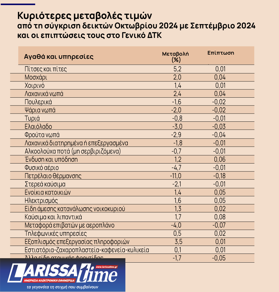 Η μηδενική μεταβολή του Γενικού ΔΤΚ (πληθωρισμός) τον μήνα Οκτώβριο 2024, σε σύγκριση με τον αντίστοιχο Δείκτη του Σεπτεμβρίου 2024, προήλθε κυρίως από τις μεταβολές στις ακόλουθες ομάδες αγαθών και υπηρεσιών: