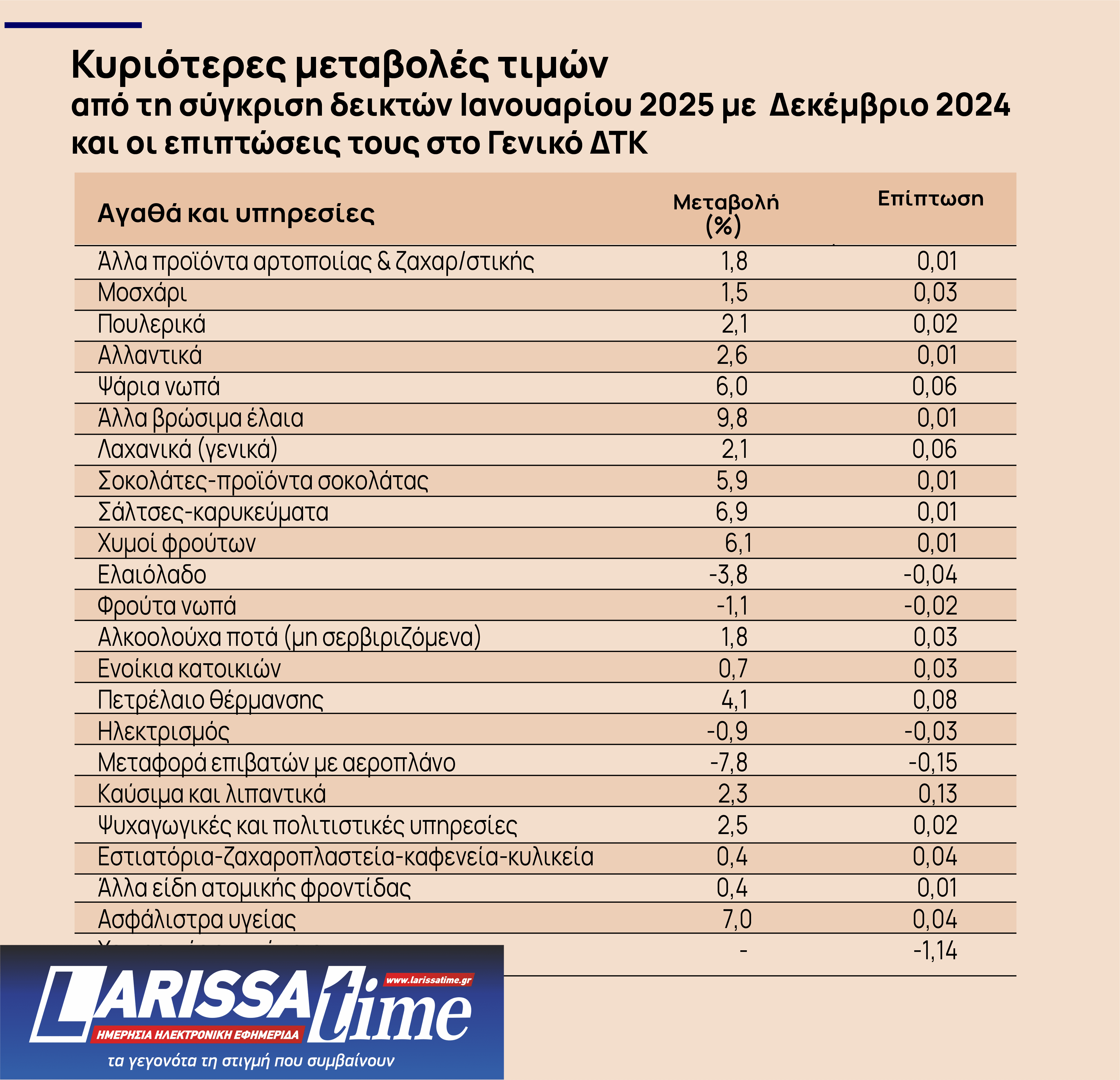 – 0,1% στην ομάδα Διατροφή και μη αλκοολούχα ποτά, λόγω αύξησης κυρίως των τιμών σε: μοσχάρι, χοιρινό, νωπά ψάρια, αποξηραμένα φρούτα και ξηροί καρποί, λαχανικά κατεψυγμένα, ζάχαρη-σοκολάτες-γλυκά-παγωτά, καφές-κακάο-τσάι, μεταλλικό νερό-αναψυκτικά-χυμοί φρούτων. Μέρος της αύξησης αυτής αντισταθμίστηκε από τη μείωση κυρίως των τιμώνσε: ψωμί και δημητριακά, αλλαντικά, γαλακτοκομικά και αυγά, ελαιόλαδο, νωπά φρούτα, νωπά λαχανικά.