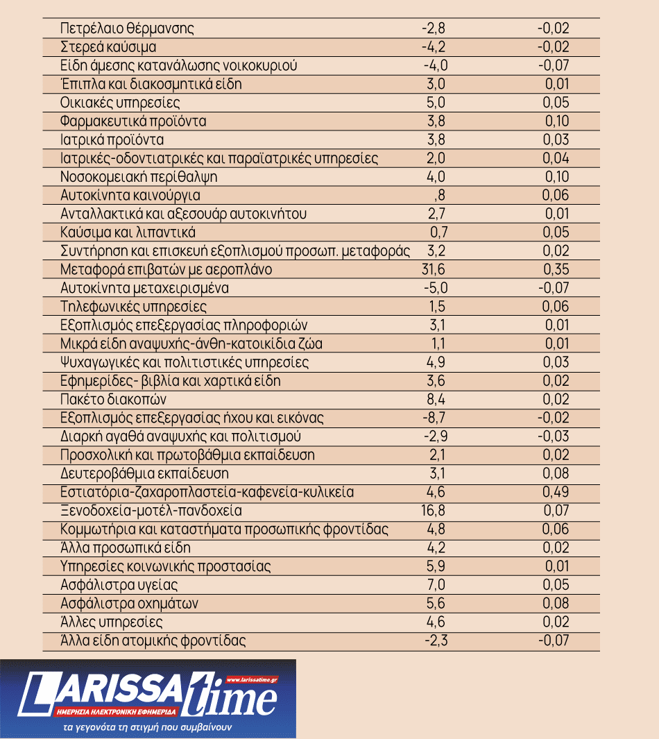αεροπλάνο» με 31,6%, το φυσικό αέριο με 26,5%, τα «Ξενοδοχεία-μοτέλ-πανδοχεία» με 16,8%, τα ενοίκια κατοικιών με 9,2% και τα πακέτα διακοπών με 8,4%. Ακόμη, ι ανατιμήσεις στα ασφάλιστρα υγείας είναι στο 7%.