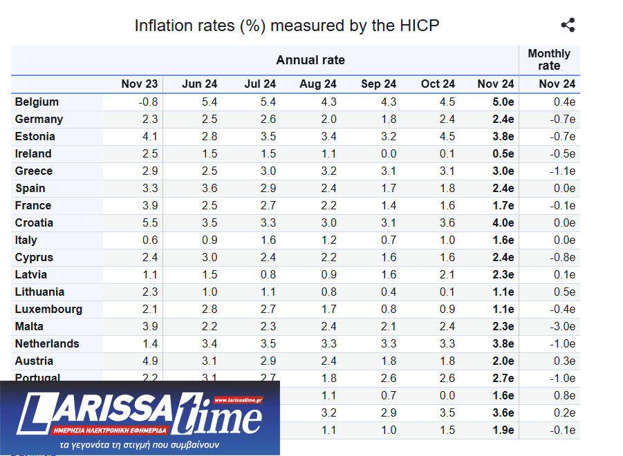 Σύμφωνα με τα στοιχεία της Eurostat, ο πληθωρισμός διατηρείται πάνω από τα επίπεδα του 3% από τον Ιούλιο (τον Ιούνιο είχε διαμορφωθεί στο 2,5%). Τον Νοέμβριο του 2023, είχε διαμορφωθεί στο 2,9%.