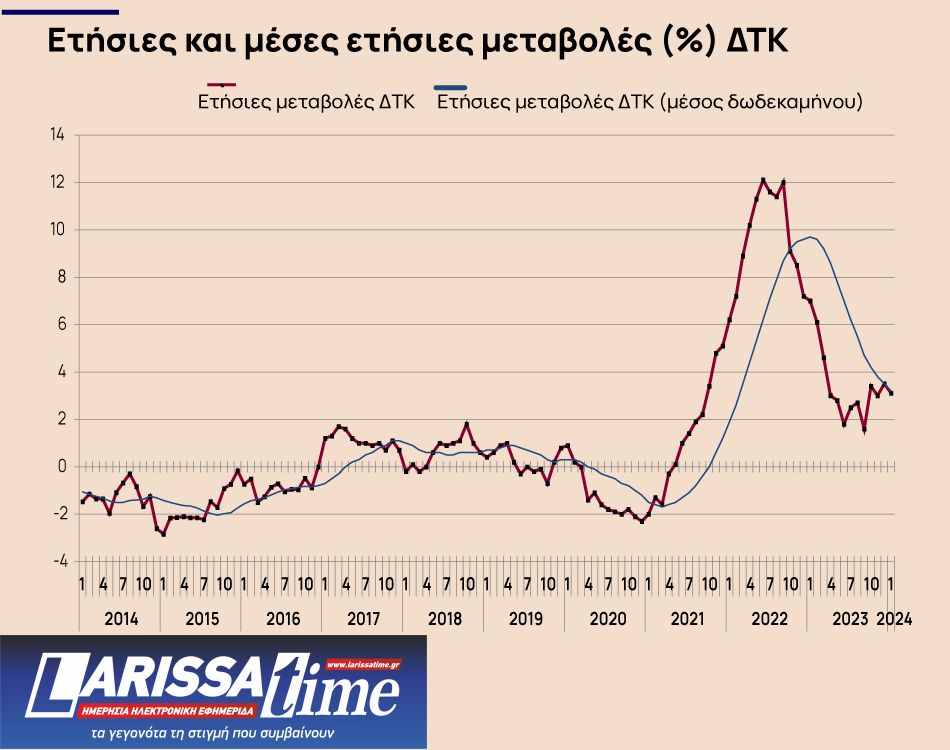 Ο μέσος ΔΤΚ του δωδεκαμήνου Φεβρουαρίου 2023 – Ιανουαρίου 2024, σε σύγκριση με τον αντίστοιχο Δείκτη του δωδεκαμήνου Φεβρουαρίου 2022 – Ιανουαρίου 2023, παρουσίασε αύξηση 3,2%, έναντι αύξησης 9,7% που σημειώθηκε κατά την αντίστοιχη σύγκριση του δωδεκαμήνου Φεβρουαρίου 2022 – Ιανουαρίου 2023 με το δωδεκάμηνο Φεβρουαρίου 2021 – Ιανουαρίου 2022.