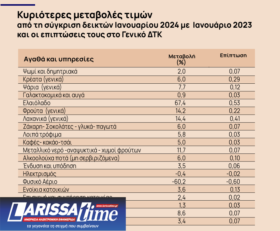 Από τον πίνακα διακρίνουμε ότι καταγράφεται αύξηση 67,4% στο ελαιόλαδο, 14% στα φρούτα αλλά και στα λαχανικά, 11,7% στο μεταλλικό νερό.