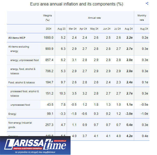 Αναφορικά με τις κύριες συνιστώσες του πληθωρισμού της ζώνης του ευρώ, οι υπηρεσίες έχουν τον υψηλότερο ετήσιο ρυθμό τον Αύγουστο (4,2%, έναντι 4,0% τον Ιούλιο), ακολουθούμενες από τα τρόφιμα, το αλκοόλ και τον καπνό (2,4%, έναντι 2,3% τον Ιούλιο), τα μη ενεργειακά βιομηχανικά αγαθά (0,4%, έναντι 0,7% τον Ιούλιο) και την ενέργεια (-3,0%, έναντι 1,2% τον Ιούλιο).