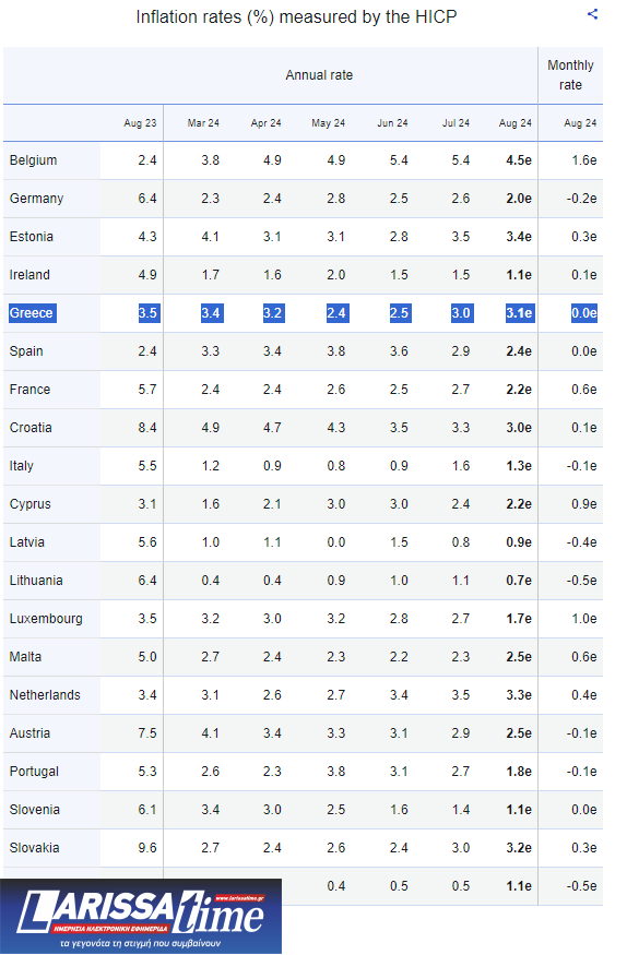 Στο 3,1% διαμορφώθηκε ο πληθωρισμός στην Ελλάδα τον Αύγουστο (από 3% τον Ιούλιο), σύμφωνα με τις προκαταρκτικές εκτιμήσεις της Eurostat, ενώ άγγιξε το 2,2% στην ευρωζώνη (από 2,6%).