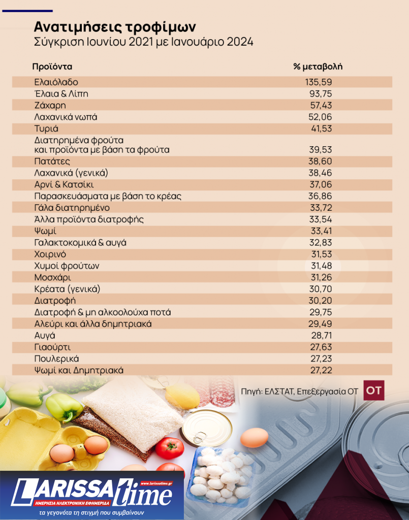 Από τα νωπά λαχανικά (+52%) και τα τυριά (+41,5%) μέχρι τα κρέατα +30,7%), τα αυγά (+28,7%) το γιαούρτι (+27,6) και το ψωμί (+33,4%) , οι αυξήσεις τιμών είναι δυσανάλογες με την όποια κινητικότητα των μισθών.