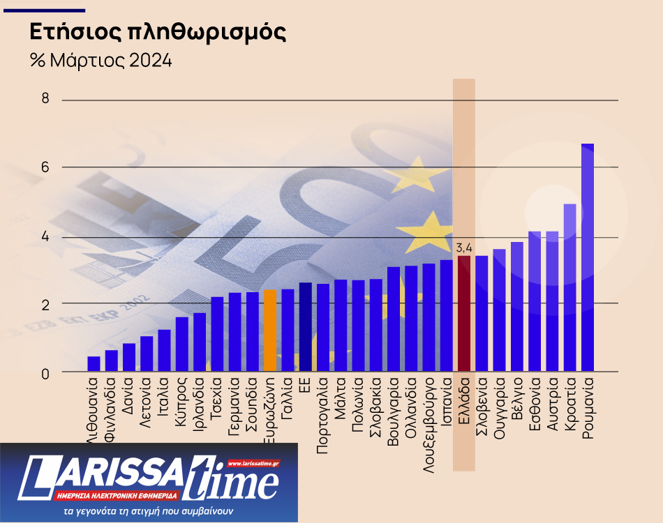 Στο 3,4% διαμορφώθηκε τον Μάρτιο του 2024 ο πληθωρισμός στην Ελλάδα σύμφωνα με τα στοιχεία που έδωσε την Τετάρτη στη δημοσιότητα η Eurostat, μειωμένος κατά 2 ποσοστιαίες μονάδες σε σχέση με τον πληθωρισμό του Μαρτίου 2023 (5,4%) αλλά αυξημένος κατά 0,3 π.μ. σε σχέση με τον προηγούμενο μήνα, Φεβρουάριο του 2024 που είχε κλείσει στο 3,1%.