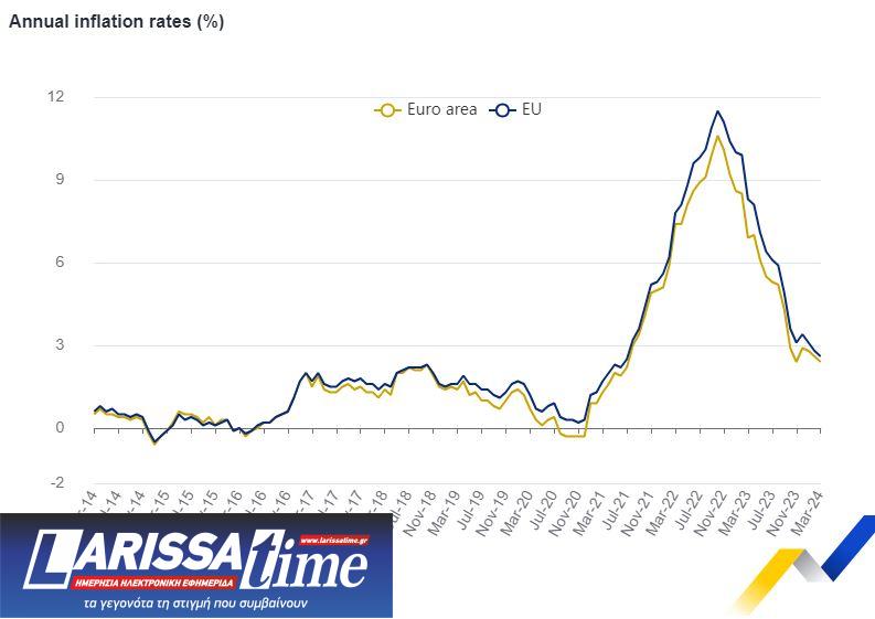 Ο πληθωρισμός σε επίπεδο ευρωζώνης ήταν 2,4% σχεδόν τρεις φορές πιο κάτω σε σχέση με έναν χρόνο πριν, όπου είχε διαμορφωθεί στο 6,9%. Σε μηνιαία βάση σημείωσε επίσης υποχώρηση καθώς τον Φεβρουάριο 2024 είχε κλείσει στο 2,6%.