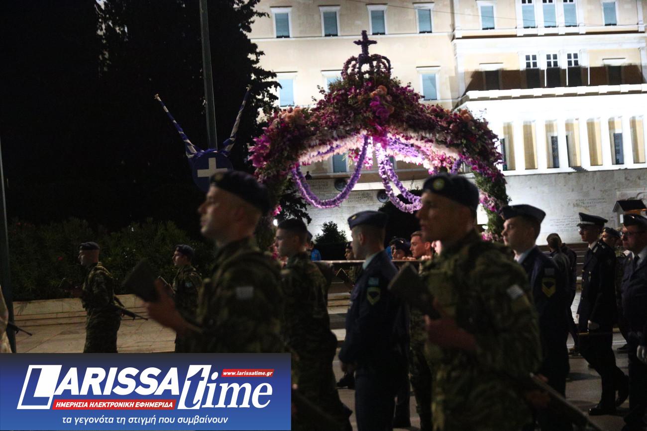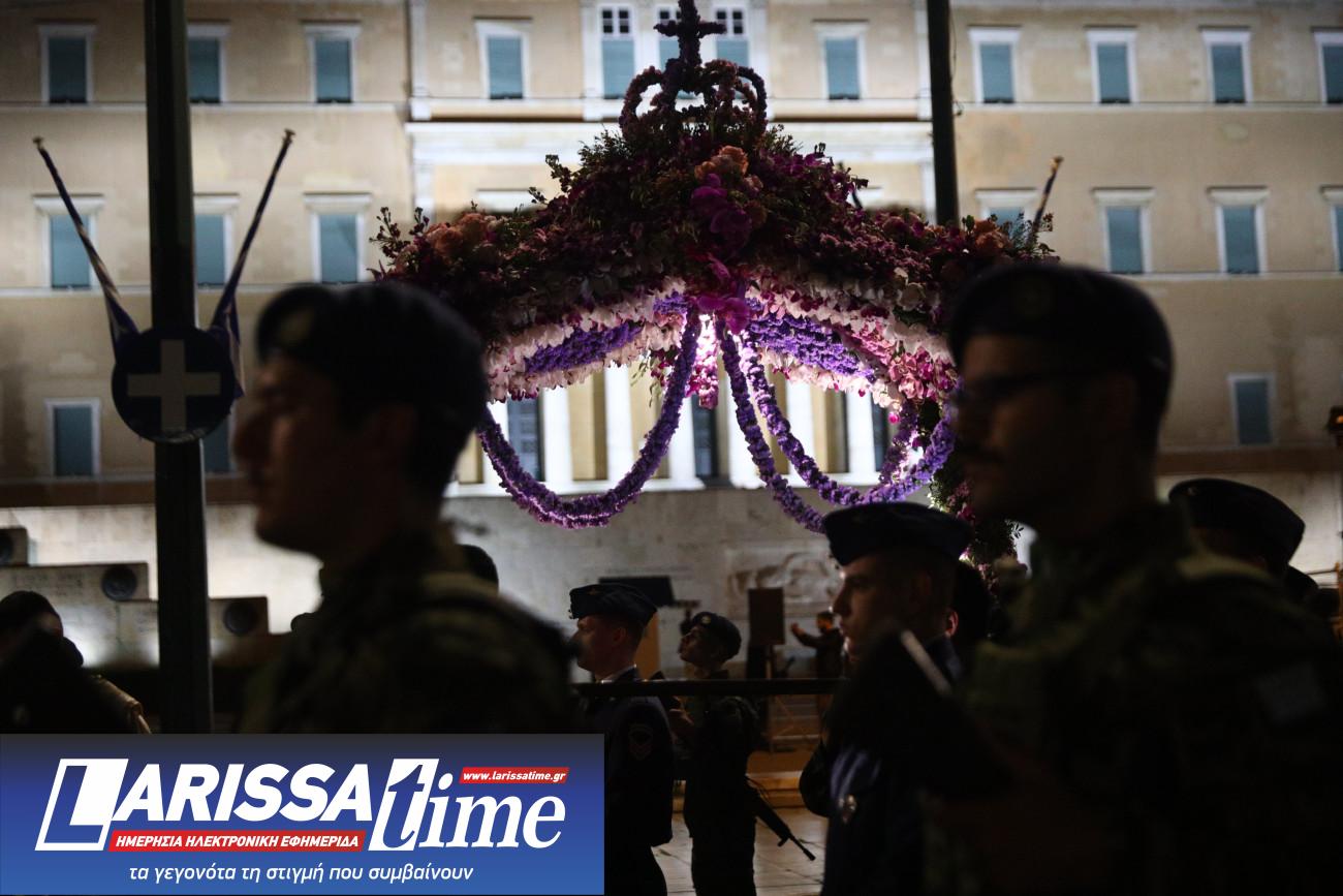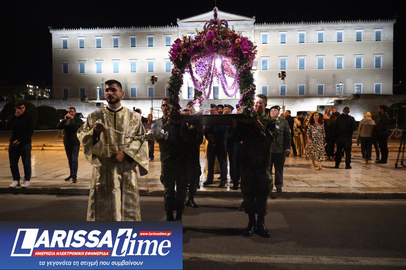 Ακολούθησε η Περιφορά του Επιταφίου στο κέντρο της Αθήνας, στη διάρκεια της οποίας ψάλθηκαν τα Εγκώμια σε τρεις στάσεις, μια από τις οποίες πραγματοποιήθηκε μπροστά από τη Βουλή και το Μνημείο του Αγνώστου Στρατιώτου. Στα εγκώμια ακούστηκε και το μοιρολόι της Παναγίας «Ὢ γλυκύ µου ἔαρ, γλυκύτατόν µου τέκνον, ποῦ ἔδυ σου τὸ κάλλος;».