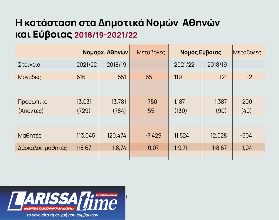 Πράγματι, στα Δημοτικά Σχολεία της Νομαρχίας Αθηνών οι διδάσκοντες μειώθηκε σε σχέση με το 2018/19 κατά 750 άτομα, αλλά την ίδια περίοδο οι σχολικές μονάδες μειώθηκαν κατά … 65 και ο μαθητικός πληθυσμός κατά 7.429 άτομα. Αυτό είχε ως συνέπεια να βελτιωθεί οριακά και στα Δημοτικά Σχολεία της Νομαρχίας Αθηνών η σχέση διδάσκοντος προς μαθητές και, πάντως, δεν επιδεινώθηκε, όπως στα Δημοτικά Σχολεία των Νομών Ευβοίας, Αχαϊας και Κορίνθου.