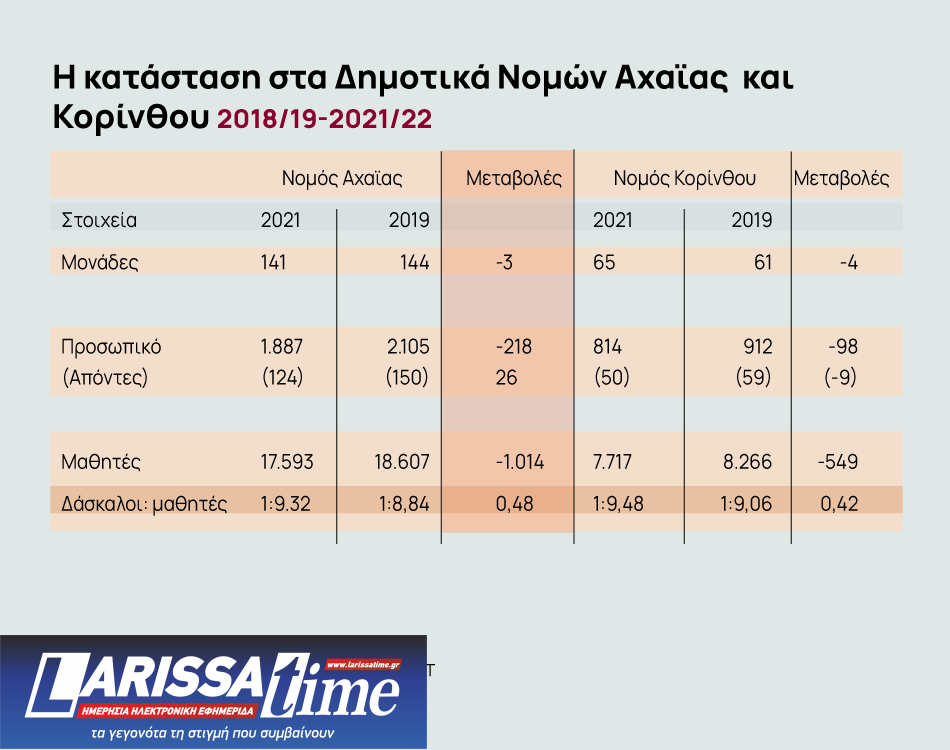 Συγκεκριμένα, στην Εύβοια επιδεινώθηκε η σχέση με την προσθήκη ενός μαθητή, καθώς οι διδάσκοντες μειώθηκαν κατά 200 άτομα και ο μαθητικός πληθυσμός κατά 504 άτομα. Η ίδια, αλλά με οριακή επιδείνωση της σχέση, παρατηρείται και στον Νομό Αχαϊας όπου οι διδάσκοντες εμφανίζονται μειωμένοι κατά 218 άτομα και οι μαθητές 1.014 άτομα, και στον Νομό Κορίνθου, όπου οι διδάσκοντες μειώθηκαν κατά 98 άτομα, όπως και οι μαθητές κατά 5439 άτομα και οι σχολικές μονάδες κατά τέσσερις.