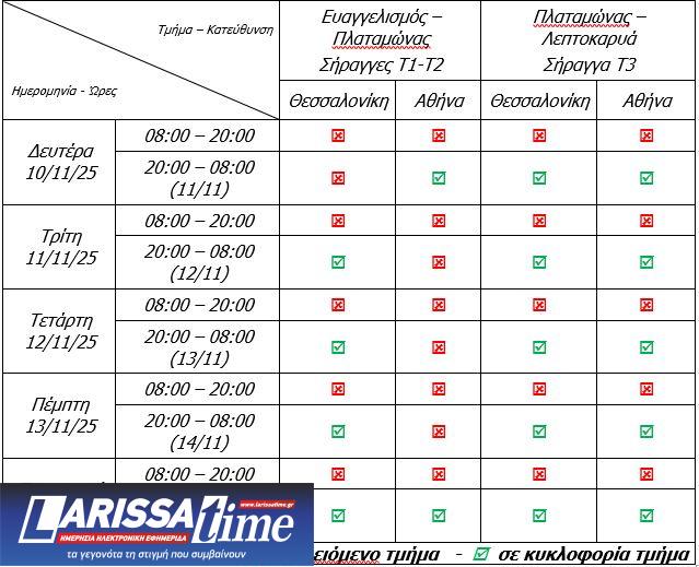 Τρίτη 11 Νοεμβρίου 2025 απόγευμα: απόδοση σε κυκλοφορία τμήματος Ευαγγελισμός – Λεπτοκαρυά προς Θεσσαλονίκη και Λεπτοκαρυά – Πλαταμώνας προς Αθήνα (θα παραμείνει αποκλεισμένο το τμήμα Πλαταμώνας – Ευαγγελισμός προς Αθήνα).
