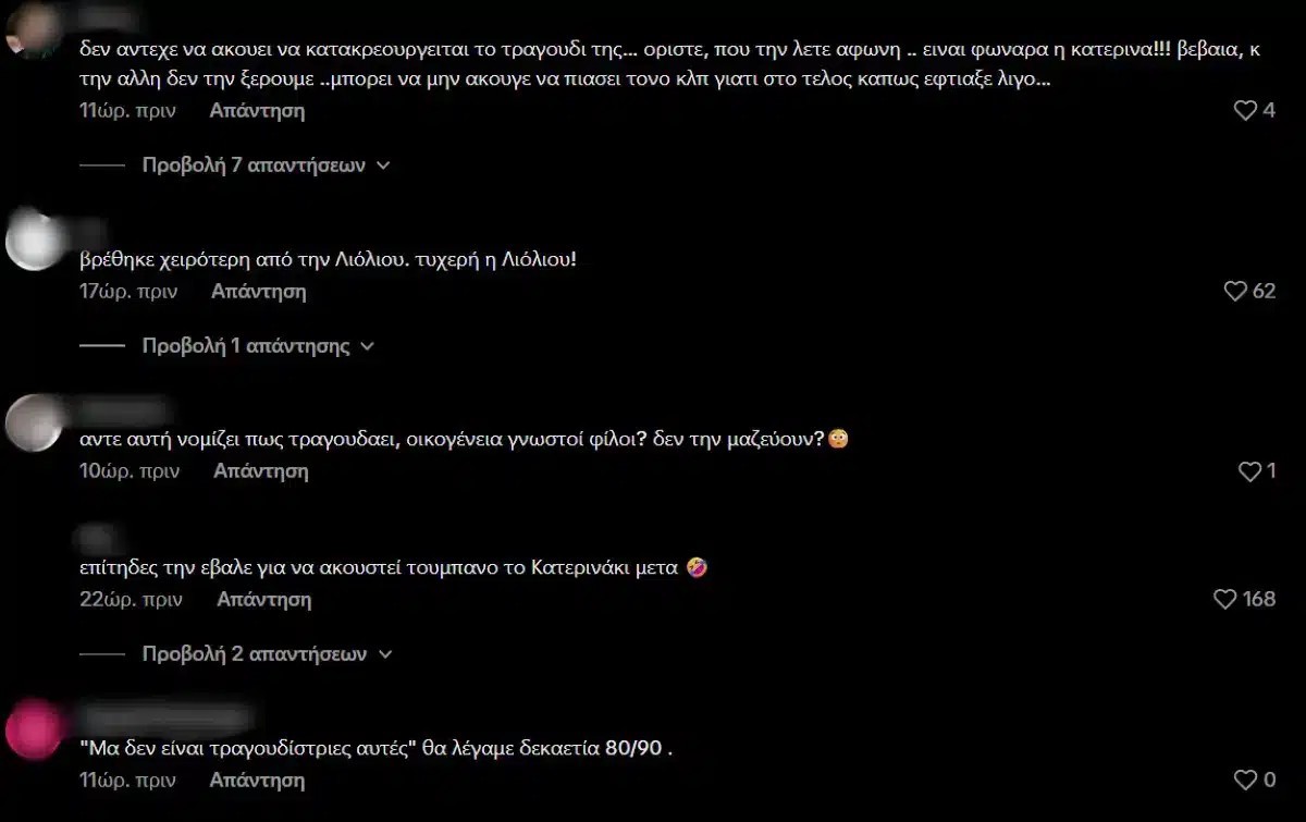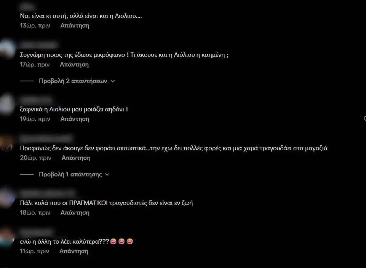 Το βίντεο ανέβηκε στον λογαριασμό της vocal coach Chryssanthemis και τα σχόλια από κάτω δεν άργησαν να πάρουν φωτιά, με αρκετούς χρήστες να τρολάρουν τη Ματίνα Ζάρα για την εκτέλεσή της. Βέβαια, δεν έλειψαν και τα αρνητικά σχόλια για την Κατερίνα Λιόλιου, με πολλούς να γράφουν ότι ούτε εκείνη είναι καλή φωνητικά.