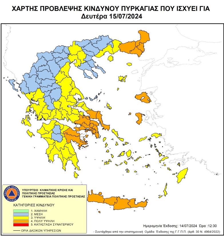 Πολύ υψηλός κίνδυνος πυρκαγιάς (κατηγορία κινδύνου 4) προβλέπεται αύριο (Δευτέρα, 15/7) στις περιφέρειες Αττικής και Κρήτης καθώς και σε περιοχές της Πελοποννήσου, της Στερεάς Ελλάδας, του Βορείου Αιγαίου, της Ανατολικής Μακεδονίας και Θράκης, σύμφωνα με το Χάρτη Πρόβλεψης Κινδύνου Πυρκαγιάς που εκδίδει η Γενική Γραμματεία Πολιτικής Προστασίας του υπουργείου Κλιματικής Κρίσης και Πολιτικής Προστασίας (civilprotection.gov.gr).